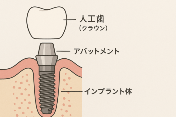 インプラントは、顎の骨に埋め込む「インプラント体」、歯肉を貫通する「アバットメント」、その上に装着する「人工歯(クラウン)」から構成されています。